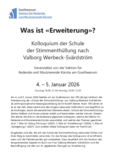 Am 4. und 5. Januar 2024 feierten wir am Goetheanum das 100-jährige Jubiläum der Anerkennung der «Schule der Stimmenthüllung» von Valborg Werbeck-Svärdström als anthroposophische Gesangsausbildung durch Rudolf Steiner. Nach 100 Jahren ist es an der Zeit, diese neue Kunst des Singens bewusster methodisch und begrifflich zu durchdringen, damit die wesentlichen Elemente dieser «Schule der Stimmenthüllung» lehrbar bleiben und immer präziser erlebt und beschrieben werden können. Diesem Ziel dienen die drei im Jahresabstand geplanten Kolloquien, welche die Sektion der redenden und musizierenden Künste veranstaltet, und welche den Themen gewidmet sind: 1. Was ist «Klang-Führung»? (2025), 2. Was ist «Erweiterung»? (2026), 3. Was ist «Spiegelung»? (2027).